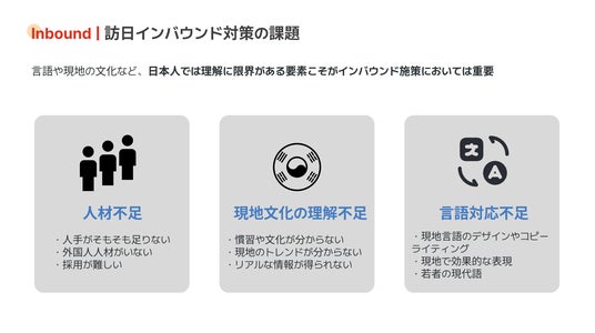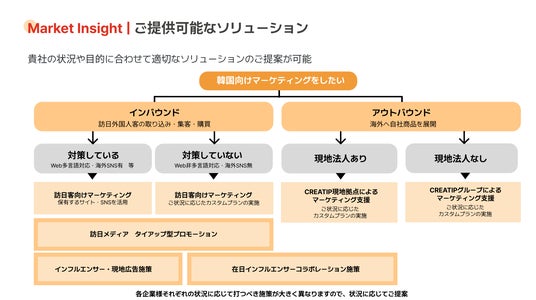 ・CREATIPの新体制当社は、日本と韓国それぞれに法人を持ちながら、各国のマーケティングの知見を元に、幅広くマーケティング支援をしています。韓国のさまざまなネットワークを通じ、韓国人観光客向けのマーケティング施策や韓国へのアウトバウンド領域において、日本法人と韓国法人のノウハウを活かしサポートします。