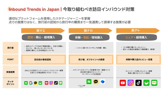 そこで当社は、訪日外国人の集客を強化したい百貨店、量販店、食品メーカー、宿泊/観光施設、旅行代理店等に向け、これまで培ってきた各業界のリーディングカンパニーや各国市場におけるグローバルマーケティングの知見を元に、広告運用・インフルエンサー施策・PR・SNS運用まで一気通貫したフルパッケージサポートを展開します。