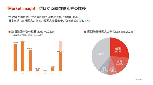 株式会社CREATIP(本社:東京都港区/ 代表取締役 CEO:蝦名 将/以下、当社)は、訪日外国人の国別ランキングのトップを誇る韓国人への各社のインバウンド対策への、戦略から企画や運用まで一気通貫したマーケティングソリューションの提供を強化致します。また、韓国法人の15周年に際し、日本におけるインバウンド需要の高まりにおいて、日韓におけるグローバルマーケティング支援をより強化することをお知らせします。・訪日外国人へのマーケティング施策体制強化の背景コロナ禍が明け、訪日外国人数は2023年10月に2,516,500人と2019年同月を超え、コロナ禍以前の水準を超す勢いとなっています※1。また、2023年8月から中国の海外団体旅行規制が解禁されたことで、訪日外国人客の人数が増加し、2023年現在の円安傾向により、より多くの外国人が訪日しやすくなってきています。