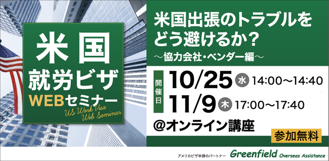 米国ビザ申請代行業務をおこなう株式会社グリーンフィールド・オーバーシーズ・アシスタンス(本社:東京都千代田区 代表取締役社長:渡邊 究)は、2023年10月25日(水)と2023年11月9日(木)に米国ビザ取得をご検討中の企業様に向け米国出張時のトラブル回避をテーマにしたWEBセミナーを開催します。