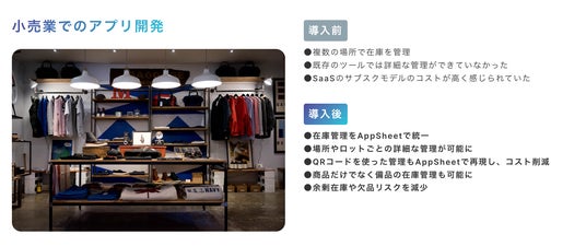 たとえば、小売業でのアプリ開発。複数のツールで在庫を管理しているケースでも「未来シコウ」を導入すれば、Appsheetで在庫管理を一つに。場所やロットごとなど在庫を細かく管理することが可能となり、余剰在庫や欠品リスクは減少します。