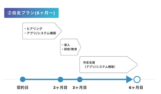 2.自走プラン(6ヶ月~)ゆくゆくは社内でアプリ開発をしていきたい企業におすすめのプラン。3ヶ月間で1つ目のアプリが完成した後に、3ヶ月間の伴走期間を設け、アプリ開発の方法をレクチャーします。常にサポート体制は整えておりますし、場合によっては期間の延長も可能ですので、ご安心ください。