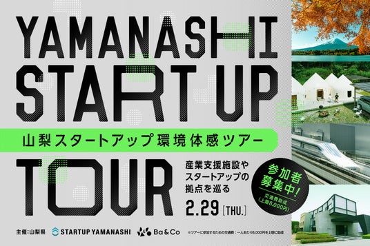 シェアードワークプレイス「co-ba」を運営するバ・アンド・コー株式会社(本社:東京都渋谷区 代表取締役会長:中村真広)は、山梨県とともに、2024年2月29日に山梨県や全国のローカルで事業を検討しているスタートアップと支援者を対象に、山梨県の事業支援のスタンスや環境を感じてもらうことを目的とした「山梨スタートアップ環境体感ツアー」を開催します。