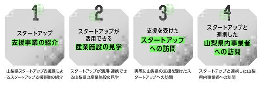 ツアーの内容としては、1.山梨県スタートアップ・経営支援課によるスタートアップ支援事業の紹介、2.ものづくり支援を行う産業技術センター、果樹の実験を行う果樹試験場といったスタートアップが活用できる産業施設の見学、3.実際に山梨県の支援を受けたスタートアップへの訪問、4.スタートアップと連携した山梨県内事業者への訪問を行います。