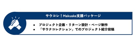 「サウコレ!Makuake支援パッケージ」について従来の「サウコレ!Makuake支援パッケージ」は、これから「Makuake」でプロジェクトを実施する予定のサウナ関連事業者のプロジェクト実施を支援するパッケージです。