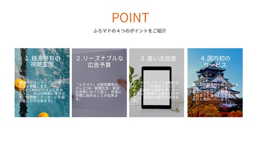デジタルサイネージ広告をはじめ、子育て世帯向け・インバウンド向けのサービス等、地場産業との連携を行い、五感を通じ、日本のお風呂文化を広く知っていただき、銭湯にとって新しいサービスのサポートを行いたいと思います。