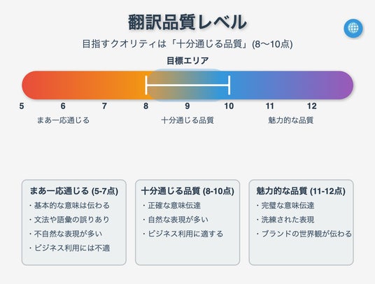 十分に通じる翻訳のクオリティを10点とすると、上記のプロセスを経た「ブランドに寄り添った魅力的な翻訳」は12点に相当します。