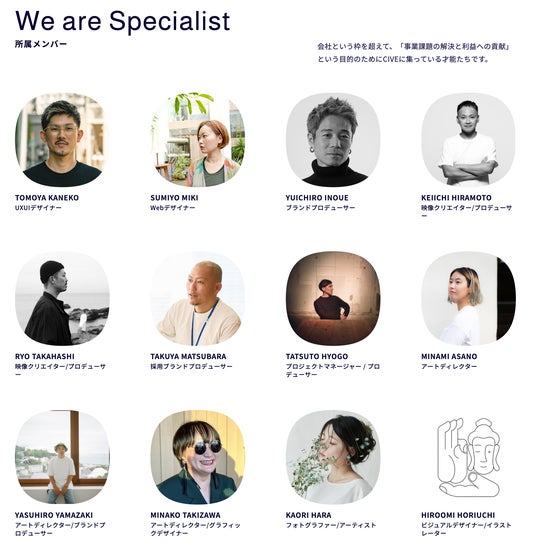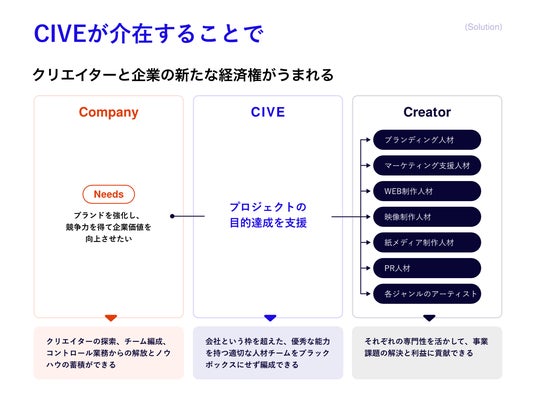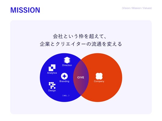 CIVEは、フリーランスや企業所属のプロフェッショナルが業務提携で結びついた、クリエイションプラットフォームとして課題解決と利益への貢献を目指します。