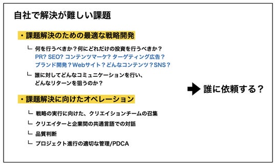 戦略から制作までさまざまなプロセスが存在するが、自社のリソースでカバーできる企業は少なく、適切な外部パートナーのアサインは難しい。