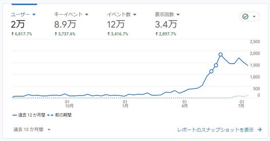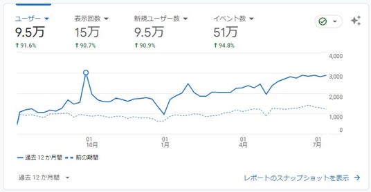 下記のグラフは、実際に1年間、少しずつコンテンツをサイトにアップさせていった会社の実際のアクセス解析(GA4)です。