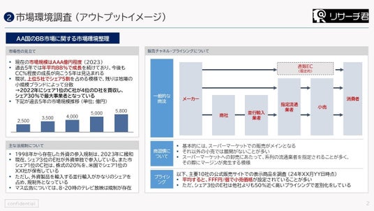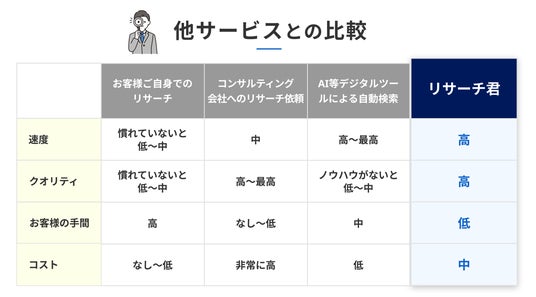 株式会社アスピレテック(本社:東京都千代田区、代表取締役:周 涵)は、最新AIを活用したデスクトップリサーチ丸投げサービス「リサーチ君」を正式にリリースいたします。このサービスは、新規事業企画担当者のようなデスクトップリサーチに対して課題を持つユーザーに対し特定の市場についての調査や、デプス調査、プロジェクト進行のためのサポートを代行することで、企画担当者の業務効率を大幅に改善します。