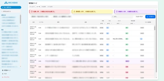 開発中の管理者ページ画面:管理担当者はユーザーの利用ログや、ユーザーからのフィードバック・コメント等を確認することが可能