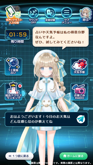 「ウララ//プロトコル」のホーム画面。ボタン操作で直感的に操作可能です。
