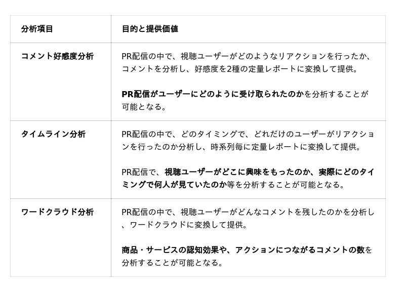 プレリリース期間では、再生数、エンゲージメント等の定量情報のレポート提供のみだったレポート機能ですが、新たに提供を開始する「分析レポートβ版」では、以下の詳細なインサイトを提供します。