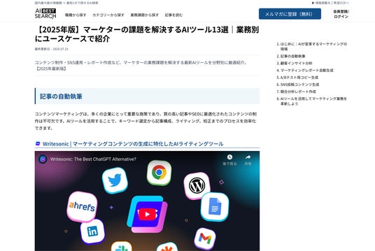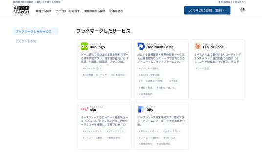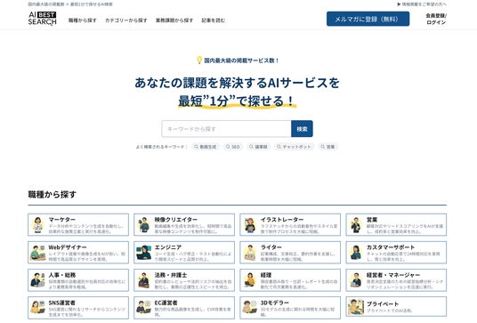 https://ai-best-search.com/ )』は、「目的」「業務課題」「職種」などから最適なAIサービスを最短1分で見つけられる検索・比較プラットフォームです。