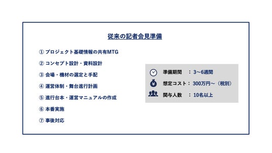 現在、スタートアップや中小企業、あるいは大企業内のいちプロジェクトが革新的な技術やサービスを生み出しても、「広報予算の壁」によってメディアに届かない現状があります。「記者会見は数百万かかる」「準備に1ヶ月以上かかる」という業界の固定観念(バイアス)が、多くのニュースの芽を摘んでいました。 私たちはこの状況を、情報の多様性を阻害する社会的な損失であると捉えました。