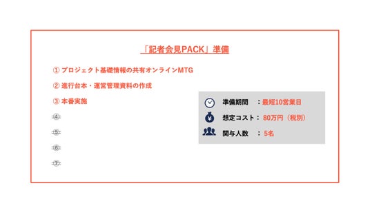 【ご注意事項】本サービスは「舞台と演出」を提供するパッケージです。メディアの招聘(誘致)、リリース配信、受付スタッフ、プレゼンスライド作成は基本パックに含まれません。(貴社リソースの活用、または別途オプション対応となります)