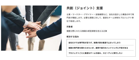 サービス説明カード:共創(ジョイント)支援。外部の専門家とのチーム組成をサポート。