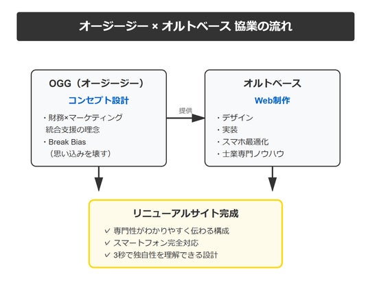 オージージーとオルトベースの協業の流れを図解。戦略財務の専門性と、士業専門サイト制作のノウハウを統合し、リニューアルサイトを完成