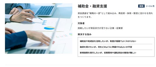 サービス説明カード:補助金・融資支援。融資・補助金活用をリードし、資金調達を安定化。