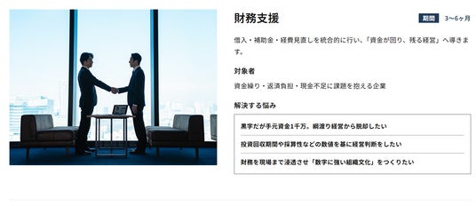 財務支援、マーケティング支援、補助金・融資支援、共創支援の4つのサービスを、カード形式で整理。それぞれの支援内容が一目で理解できる構成にしました。