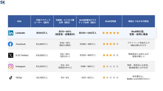 一方、LinkedInはユーザー数550万人(国内)のうち、決裁者比率が70~80%とBtoB営業に最適なプラットフォーム。実名登録ユーザーが中心であり、個人のDMを通じて経営層と直接コミュニケーションが可能です。
