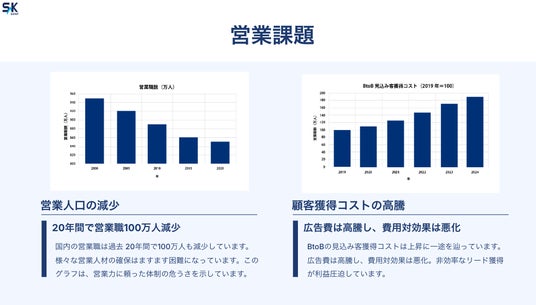 同時に、デジタル広告の普及によりBtoB リード獲得コストは年々高騰。従来のテレアポ・メール・Web広告に頼る営業手法では、CPA(顧客獲得単価)の悪化と営業力のバラつきが問題化しています。