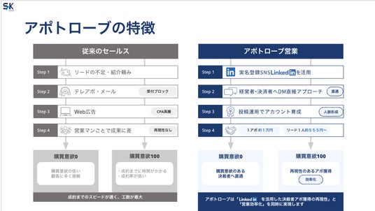 株式会社S&Kエージェント(代表取締役:片岡 義仁、大阪市北区)は、LinkedInを活用したBtoB向けリード獲得サービス『アポトローブ』を本格始動いたします。半年以上のテスト期間を経て、サービスクオリティを大幅にブラッシュアップしました。営業人口が20年間で100万人減少し、顧客獲得コスト(CPA)の高騰が続く中、本サービスは決裁者が実名登録するLinkedInを活用し、受付を介さず経営層に直接アプローチ。システム化されたリード供給により、従来の営業手法では困難だった「再現性あるアポ獲得」を実現します。キーエンス出身の代表が培ったコンサルティング営業ノウハウを体系化し、営業部全体のプロセスを計画・実行・改善のサイクルで包括的に支援します。