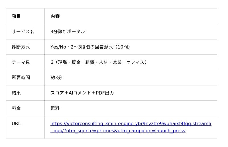 VICTOR CONSULTING「3分診断ポータル」を公開~10問のセルフ診断×AIコメント×PDF出力で、経営の停滞ポイントを即時発見~