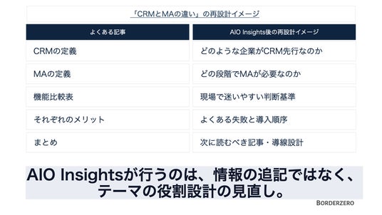 こうした背景から、AIO Insightsでは単なる情報追加やリライト案の提示ではなく、そのテーマが事業の中でどの役割を担うべきかを見直すことを重視しています。