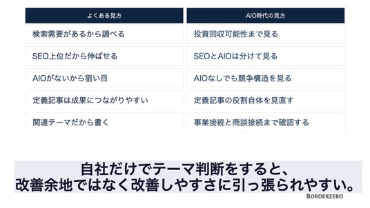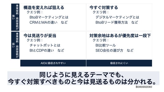 どのテーマがAIに吸収されやすく、どのテーマなら事業成果につながる形で再設計できるかを見極めることが重要だとBorderZeroは考えています。