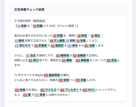 本ツールは最終判断を代替するものではなく、あくまで一次チェックを効率化するための支援ツールです。広告表現の最終的な適否は、文脈、画像との組み合わせ、媒体基準、法改正、行政判断などによって異なる場合があります。そのため、重要案件については専門家による最終確認を推奨しています。