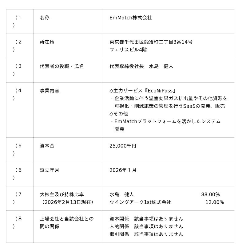 株式会社アスア 株式会社アスア(以下「当社」)は、2026年2月13日開催の取締役会において、ウイングアーク1st株式会社(本社:東京都、代表取締役社長執行役員CEO:田中 潤、以下「ウイングアーク社」)より「EcoNiPass」事業を継承し、設立されたEmMatch株式会社(本社:東京都千代田区、代表取締役社長:水島 健人、以下「EmMatch社」)の株式を取得し、資本業務提携契約を締結することを決議いたしましたので、下記のとおりお知らせいたします。