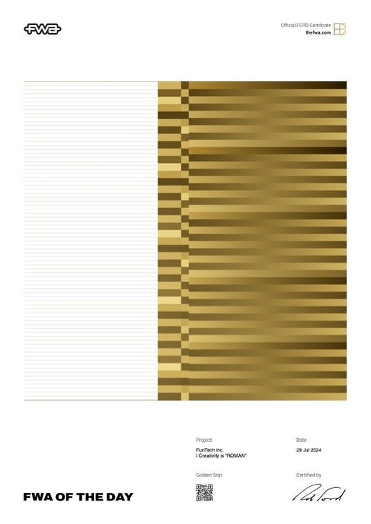 Webデザインと映像制作を手掛けるFunTech株式会社(本社:東京都渋谷区、代表取締役 太田 義孝)は、このたび自社のコーポレートサイトにて、Webデザインの世界3大アワードといわれる「CSS Design Awards」「Awwwards」「FWA」を含む4つのアワードにて賞を受賞しました。当サイトは「デザイン」「ユーザビリティ」「クリエイティビティ」「コンテンツ」「プログラミング技術」などの観点で、創造性・革新性を高く評価されました。https://www.funtech.inc/受賞内容◼︎受賞作品FunTech inc. | Creativity is “ROMAN”https://www.funtech.inc