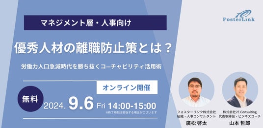 フォスターリンク株式会社(本社:東京都新宿区、代表取締役社長:倉島秀夫、以下「フォスターリンク」)は、優秀人材の離職防止策をテーマとしたオンラインセミナーを2024年9月6日(金)に開催します。