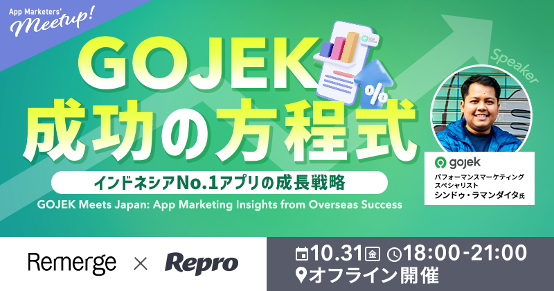 アプリリターゲティングの専門企業であるRemerge株式会社(本社:東京都渋谷区神南1-5-6、代表取締役:Pan Katsukis)は、10月31日(金)18:00より、Repro株式会社との共催でApp Marketers' Meetupを開催いたします。このイベントでは、急成長を遂げているオンデマンドサービス大手のGojekが特別セッションを実施し、参加者の皆様には、リターゲティング施策や実践的な成功事例に関する貴重なインサイトを提供いたします。