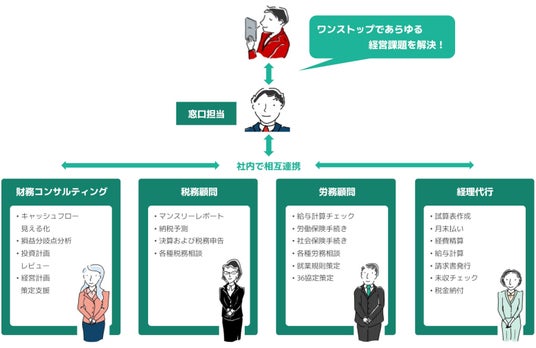 経理、財務、税務、労務、クラウド導入をプロである私たちが担うことで、お客様が本業に100%集中できる体制を実現します。