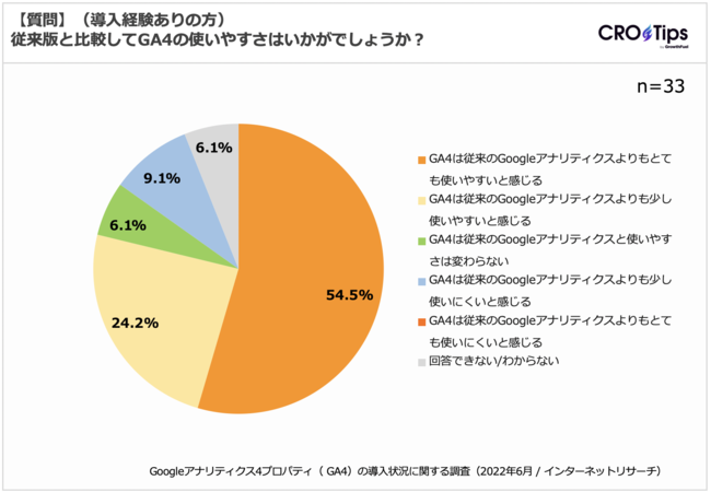 すでにGA4導入済の回答者にGA4の使いやすさについて聞いたところ、72.8%が従来版のGoogleアナリティクス(ユニバーサルアナリティクス)と比較しても使いやすいと回答した。