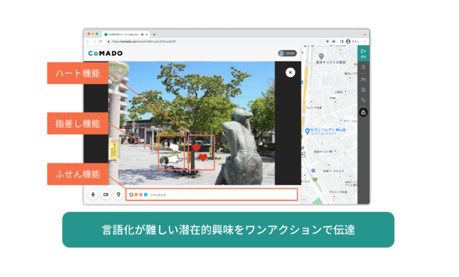 リアルなリサーチの現場と同じように、CoMADOの画面に向けて「ここ、そこ」と質問ができる指差し機能や興味関心を伝えられるハート機能により、その場で言語化できない潜在的興味や関心をプレゼンターに伝えることが可能です。そのアクションが対話を生み出し、深い洞察を得ることに繋がります。また、リサーチ中の発見をふせんに記録し、リサーチ後の共創ワークに活用することもできます。これらの機能が参加者のリサーチへの参与度を向上させ、共創を促します。
