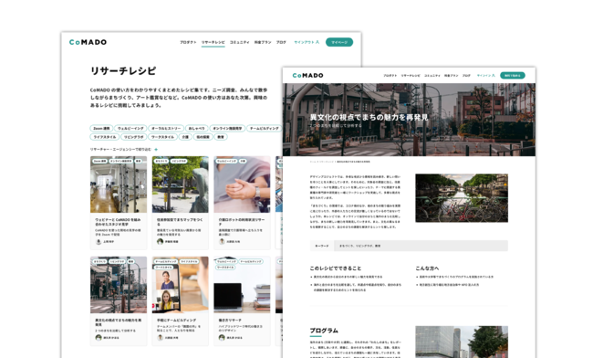 デザインリサーチャーが開発したCoMADOを活かしたリサーチプログラムをリサーチレシピ集として公開しています。まちづくりから、働き方リサーチまで、幅広いレシピを揃えています。リサーチの目的に沿ったレシピをベースに、アレンジをしながら利用することも可能です。また、レシピを開発したデザインリサーチャーにリサーチの支援を依頼することもできます。
