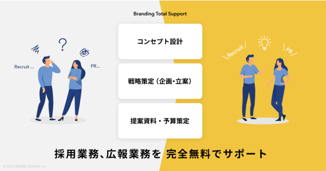 ブランドデザイン株式会社の提供する「ブランディング支援サービス」とは、採用担当者、広報担当者に特化した、採用業務、広報業務全般を戦略設計からすべて無料にて支援するサービスです。