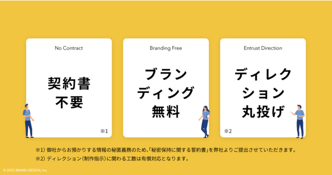 デザインに知見のある担当者による指示ではないため、ミスコミュニケーションが起きやすかったり、思っているイメージを伝えることができない等の問題をすべて弊社に一任いただけます。(制作指示に関わる工数は別途有料での対応となります)