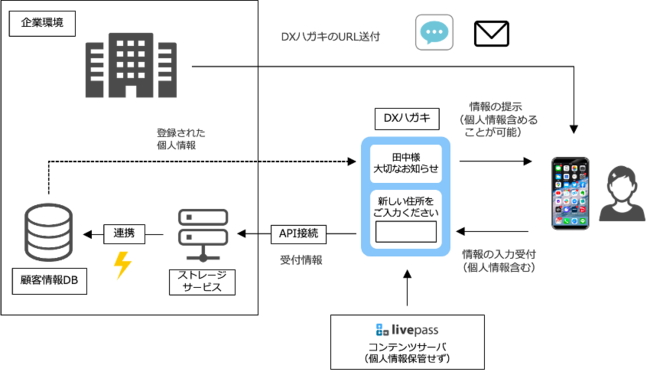 お客様に表示されるパーソナライズ情報は、端末側でベースコンテンツと合成します。また、DXハガキ上でお客様に入力された情報は、DXハガキが外部ストレージサービスなどにAPI接続して格納するため、リブパス側で個人情報を保管しません。