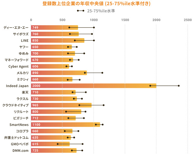 Indeed Japanの年収中央値が2000万円と圧倒的に高い年収水準であり、ついでSmartNews(1100万円)、情報システムにまつわるコンサルを行うクラウドネイティブ(965万円)と続く。
