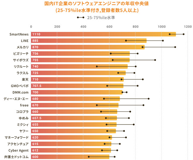 国内IT企業のソフトウェアエンジニアの年収中央値はSmartNewsが1100万円と最も高く、その次にLINE(885万円)、メルカリ(870万円)と続く。