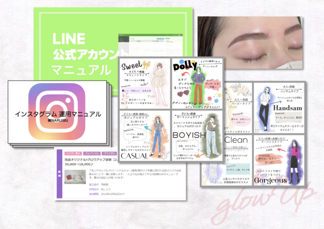 コンサルティングパッケージには、1日講習会に加え、診断メニューマニュアルや顔タイプごとの眉毛メニューマニュアルなど、「Petit」が編み出した門外不出のノウハウが満載。さらに、サロン経営に欠かせないInstagramの運用方法を詳細に記したマニュアルをお渡しするとともに、インフルエンサーを使ったマーケティング戦略についてもお伝えします。
