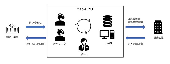 『Yap-BPO』は、製薬企業の流通管理に付帯する業務の大部分のDXを推進することでより正確な情報を瞬時に医療機関、HCPへ提供することを目的とした医薬品流通管理BPO(Business Process Outsourcing)サービスです。