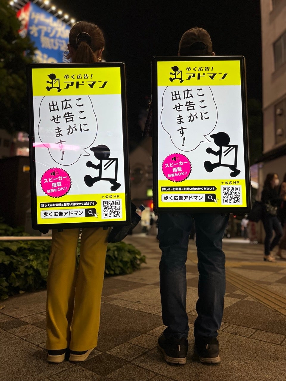 株式会社AGESが提供する「アドマン」は、32インチの大型サイネージを背負ったスタッフが、指定されたエリアを歩行することで宣伝を行う、他に類を見ない新しい形のマス向け広告サービスです。