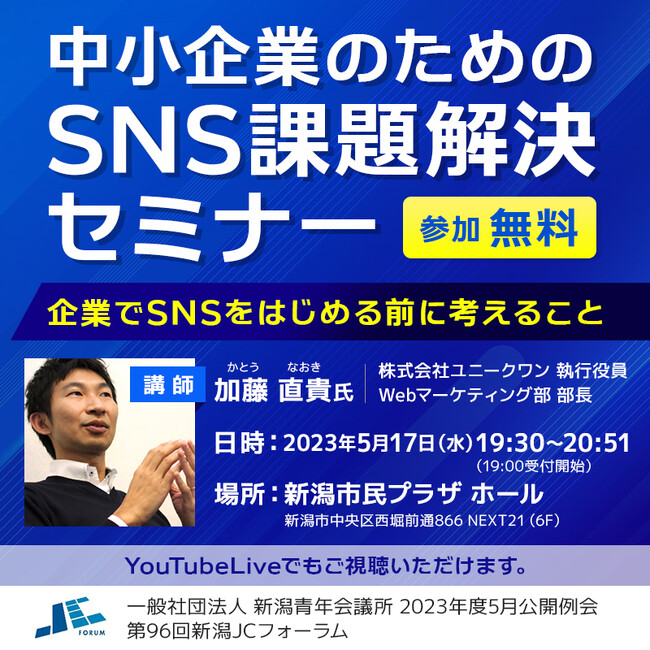 2023年5月17日(水)新潟市民プラザにて中小企業のためのSNS課題解決セミナー~企業でSNSをはじめる前に考えること~を開催致します。