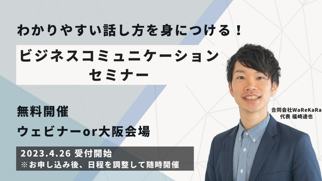 合同会社WaReKaRaの代表でカウンセラーの福崎達也が直接実施するビジネスパーソン向けのコミュニケーションセミナーがスタート。福崎自身が元々、対人恐怖症で悩みながら20代中頃までは会社員として働いていた身でもあり、今ではカウンセラーとして傾聴力を身につけながらも自身で直接集客やプレゼンも行っています。またクライアントとの対話も日々行っています。カウンセラーとしては「視線恐怖症などの社交不安障害・対人恐怖症に悩んでおり人と関わる上で不安や恐怖を感じる方」や「人前で話をする時に過度な緊張や不安に襲われるあがり症の方」、「あがり症ではないがコミュニケーションに自信がなくて会話に苦手意識が強い方」など対人関係に悩みを抱えている様々な方に対して相談に乗ることが多いですが、もちろんその中でビジネスパーソンとして働きながら取引先とのやりとりや職場の同僚との会話に対して悩みを抱えている人も多いです。今回はそういった社会人の方に向けたセミナーを開設します。